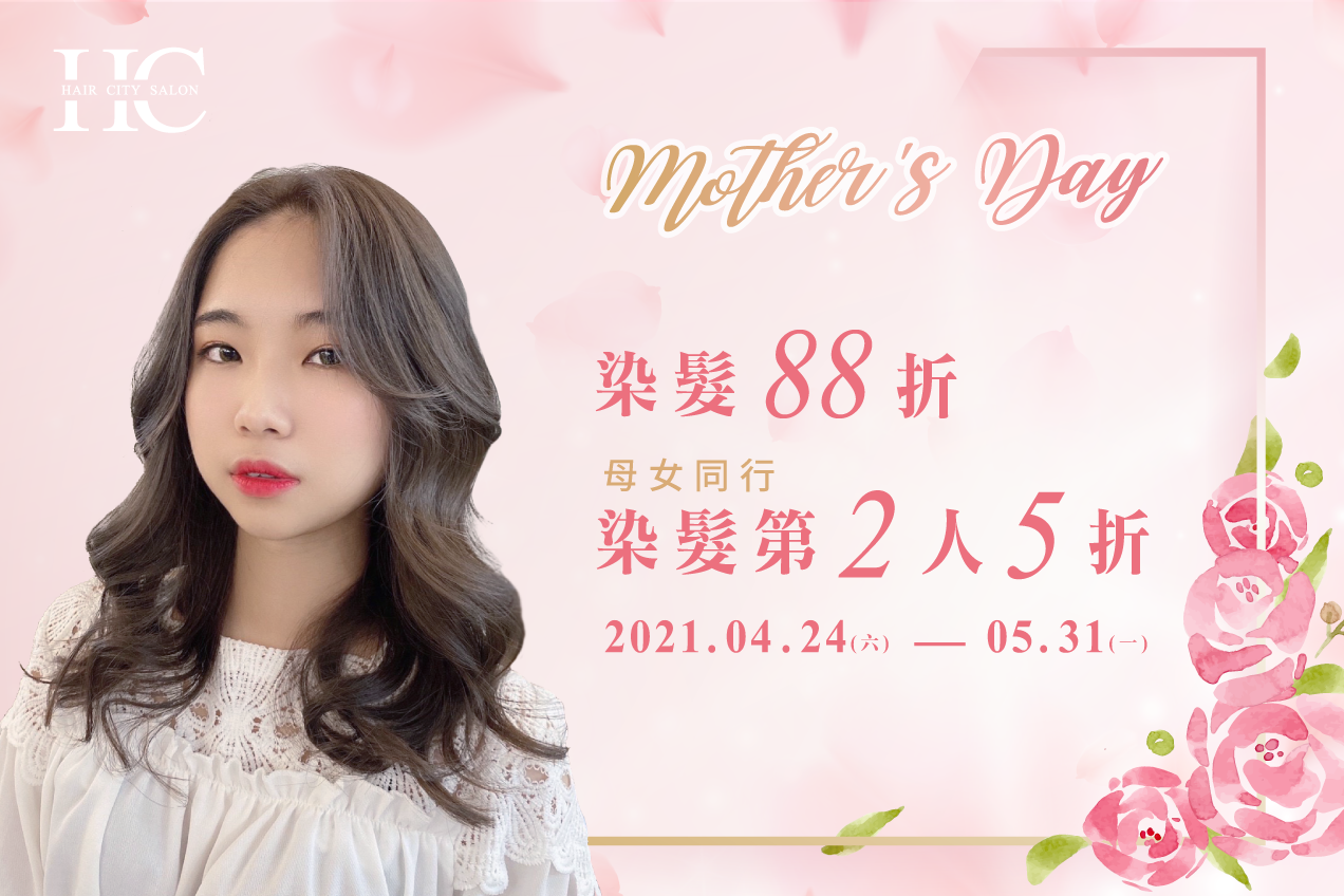 母親節染髮全面88折,母女同行享第2人5折!一年一度最重要的母親節到來,祝全天下辛苦的媽媽們母親節快樂!今年母親節,就來HairCity讓你與媽媽一起變美麗,活動期間內染髮全面88折,母女同行染髮享第2人5折,快來預約母親節燙染護優惠吧! 2021母親節活動優惠活動一、染髮88折活動期間內只要來店染髮,一率88折短髮:原價NT$2,500,88折價NT$2,200中長:原價NT$2,800,88折價NT$2,464長髮:原價NT$3,200,88折價NT$2,816活動二、母女同行染髮,第2人5折活動期間內,凡母女同行預約染髮服務,即可享第2人5折優惠,需搭配哥德式護髮以上之護髮。短髮:原價NT$3,100,第2位5折價NT$1,550。2人總共只要NT$4,650中長:原價NT$3,500,第2位5折價NT$1,750。2人總共只要NT$5,250長髮:原價NT$4,000,第2位5折價NT$2,000。2人總共只要NT$6,000HairCity燙染3大保證燙染擁有10天鑑賞期多家分店全系列使用進口萊雅、哥德式、京喚羽等知名品牌每月設計師和技術師進修燙染相關技術參加活動消費者須知染髮如選擇的顏色或髮色落差太大,需要退色才能達到一致色,需加收NT$500~NT$1,000的工本費。來到HairCity的俊男美女們放心交給專業設計師!我們會依據個人髮況、臉型、個性量身打造最適合的造型,也會給予最合適的建議,讓大家都能擁有理想中的造型!每日名額週一~週五 每天各開放4位名額週六~週日 每天各開放2位名額活動日期2021/04/24(六)~05/31(一)活動注意事項活動一、二優惠僅可二擇一,不可重複使用。可指定設計師、不指定需新客。染髮如使用到第二種染髮項目、兩段式上色或漂髮需另計費。本活動可搭配燙髮,燙髮為原價計算,可打會員折扣。優惠請於2天前來電預約,不接受當天預約報名【可直接撥電話04-2225-2906詢問是否有名額】。以上優惠無法與生日優惠以及其他的優惠同時使用。HairCity保有活動最終解釋權。※注意活動需提早預約 ,並填寫正確完整的電話填寫完之後【會與您電話或Line確認過有報名到 才算完成預約唷】行政秘書工作繁忙,如遇週休二日因訊息較多,等待時間較長,請多多見諒FB粉絲團、LINE小編僅提供基本預約諮詢服務。...