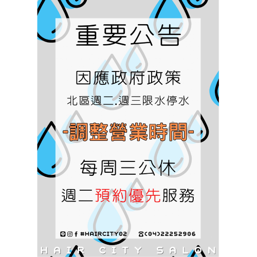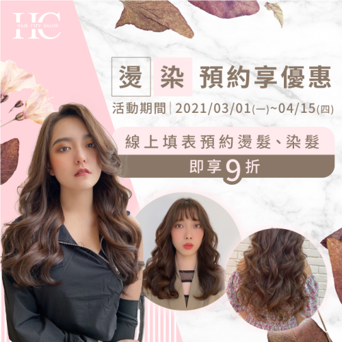 2021春夏髮型髮色流行趨勢你跟上了嗎?還在煩惱哪種造型適合自己的俊男美女們看過來!這次HairCity特別推出燙、染活動優惠!活動期間內無論短髮、長髮,燙、染線上預約即可享9折!讓專業設計師為你量身打造專屬風格,每天名額有限,趕快填寫表單搶先預約吧!活動優惠-燙染線上填表預約優惠活動期間內只要填寫表單線上預約燙、染髮,即可享9折優惠!※如需同時燙+染,可享額外低於9折的優惠!詳情歡迎【點此私訊FB粉專預約】燙髮線上預約優惠含洗髮、剪髮、基本護髮,護髮可加價升級為深層護髮,可一併享9折優惠。短髮:原價NT$3,200,9折價NT$2,880中長:原價NT$3,700,9折價NT$3,330長髮:原價NT$4,000,9折價NT$3,600染髮線上預約優惠含洗髮、剪髮、基本護髮,護髮可加價升級為深層護髮,可一併享9折優惠。短髮:原價NT$2,500,9折價NT$2,250中長:原價NT$2,800,9折價NT$2,520長髮:原價NT$3,200,9折價NT$2,880HairCity燙染3大保證燙染擁有10天鑑賞期多家分店全系列使用進口萊雅、哥德式、京喚羽等知名品牌每月設計師和技術師進修燙染相關技術參加活動消費者須知來到HairCity的俊男美女們放心交給專業設計師!我們會依據個人髮況、臉型、個性量身打造最適合的造型,也會給予最合適的建議,讓大家都能擁有理想中的造型!每日名額週一~週五 每天各開放4位名額週六~週日 每天各開放2位名額活動日期2021/03/01(日)~2021/04/15(四)優惠活動注意事項線上預約可指定設計師,如不指定設計師,限新客<未曾來消費過的> 才享有此優惠唷!優惠請於2天前預約,不接受當天預約報名【可直接撥電話04-2225-2906詢問是否有名額】。優惠無法跟其他的優惠同時使用。HairCity保有活動最終解釋權。※注意活動需提早預約 ,並填寫正確完整的電話填寫完之後【會與您電話或Line確認過有報名到 才算完成預約唷】行政秘書工作繁忙,如遇週休二日因訊息較多,等待時間較長,請多多見諒FB粉絲團、LINE小編僅提供基本預約諮詢服務。...