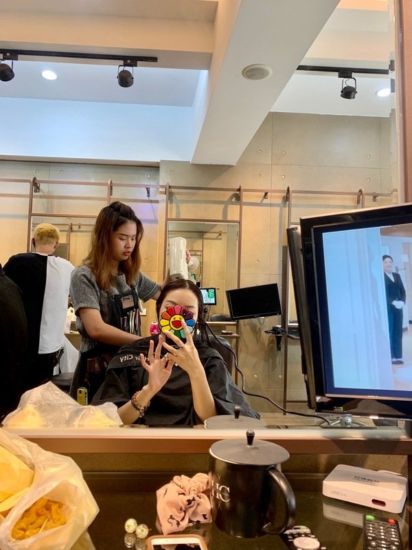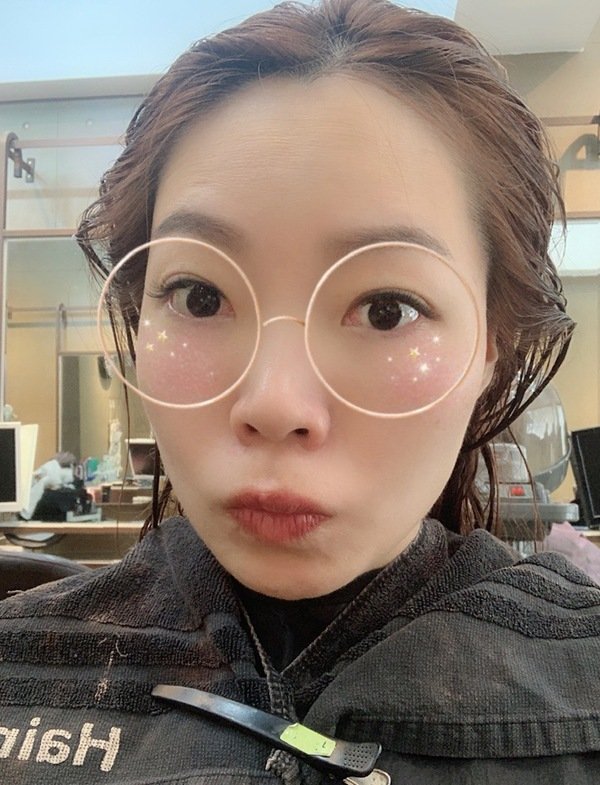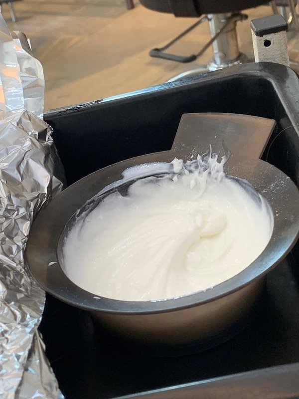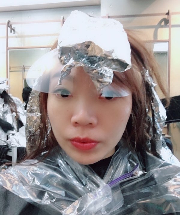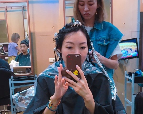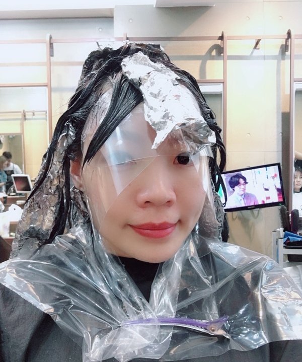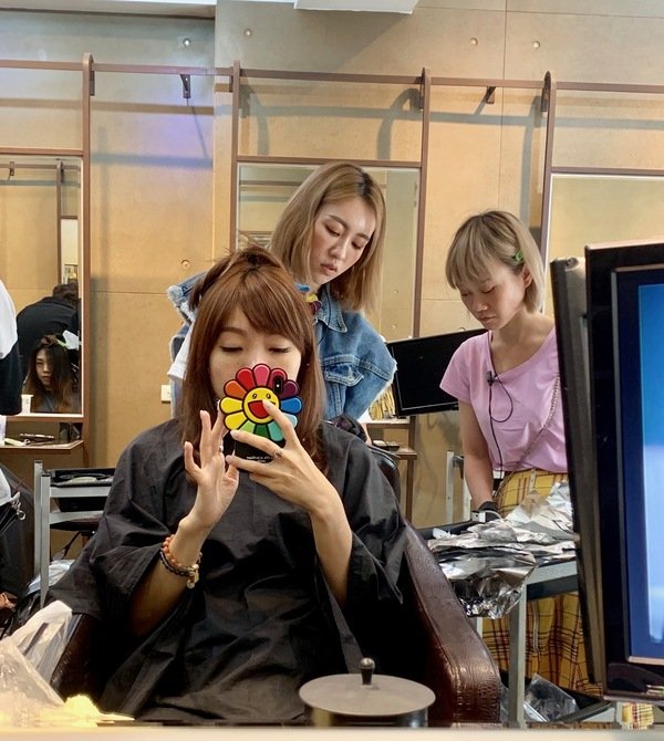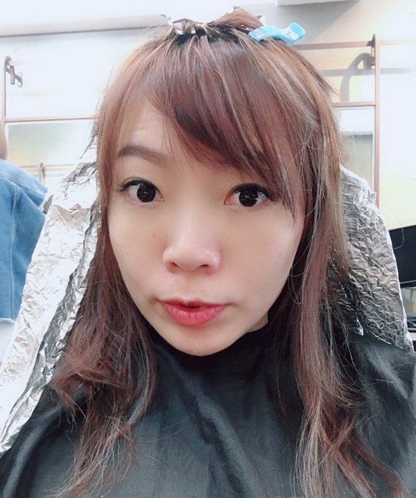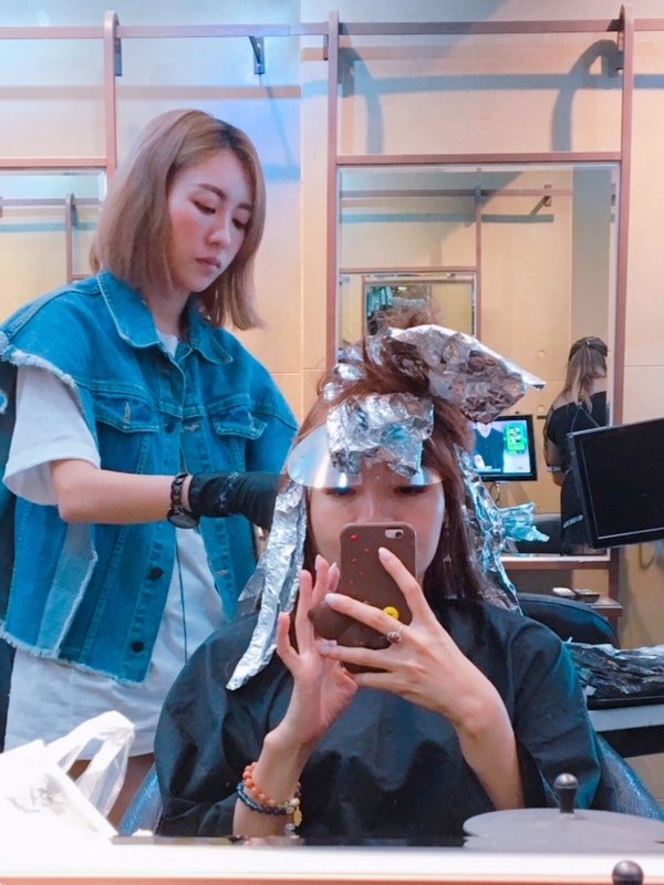 設計師Milly 與助理二人慢工出細心操作染膏時,也不忘放防護罩保護倪倪的臉龐,第一次遇到有沙龍能這麼體貼