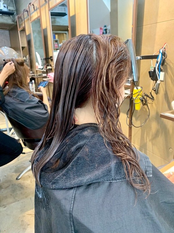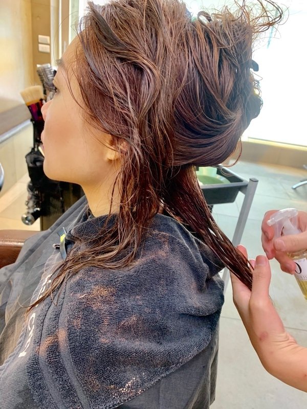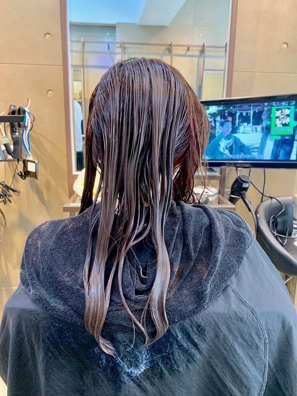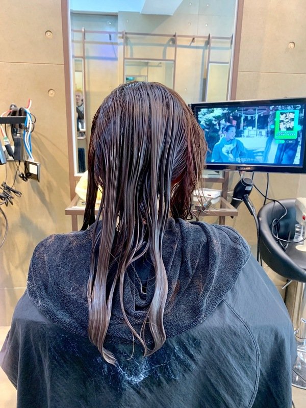 染劑大概停留一段時間倪倪在稍做染劑清洗後,設計師開始塗上京喚羽極致修護2、3劑來增加彈性、延緩掉色。然後用梳子梳均勻,稍微等待讓頭髮充分吸收沖掉後,緊接登場最後的4劑,讓倪倪頭髮形成亮面鍍膜般,補油補水畫下京喚羽修護課程完美句點。